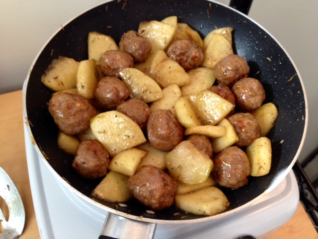 6. Return the sausage to the pan and toss with the apple until the sausage balls are heated and cooked through.