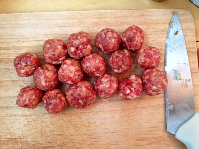 2. Remove the sausage casing from the sausages and roll into 3/4″ diameter balls