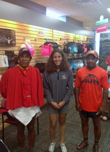 If you have read Born to Run, you know that there exists an insanely gifted tribe of mega-long-distance barefoot runners in central Mexico (Copper canyon) who have intertwined running into their culture. My local running store, Bob Roncker’s Running Spot, happened to have two of these Tarahumara runners as visitors at their store the Friday before race day. One was even one of runners from the book (Arnolfo Quimare)! I tried to use my Spanish to talk with them, but let’s face it. 12 years of Spanish later, I understand everyone and speak like a 2 year old. So I ended up going to get Nick since he’s fluent.