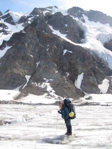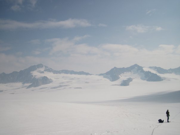 After navigating around some glacial lakes and more glacial swamps we began up a 6,000 ft pass. We made it over, and were then on the glacier feeding the East fork of the Susitna river.