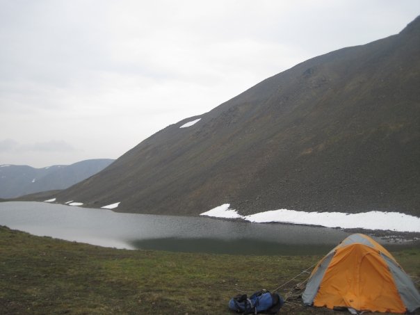 We ended up following several caribou paths (since I guess we’re following their big migration?), but after an hour we still hadn’t found the lake. A little worried, we all trusted Evan’s judgement that it had to be right over the next hill, but after that hill we still hadn’t found it. With my feet killing me it was all I could do not to get upset, and we decided to give him one more chance before we all sat down with the map and GPS to figure out where we went wrong. However, over the next hill, there sat the clear, beautiful lake we had been looking for. A few of the guys were so happy (and hot from the hike) that they dropped their packs, stripped down to their boxers, and jumped in! I was worried about my feet, but when I took off my boots and socks, it turns out they were just aching. Except for a blister the size of my big toe on my right arch, but that has been developing for a few days. I can wrap that up on Thursday before we move, and it has all day tomorrow to heal.