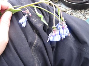 The valley on the other side of the pass was narrow and beautiful, and from our high up vantage point we could see our next pass about four miles away. So down we zigzagged into the green valley, and along the way I ran into my favorite backcountry treat: bluebells! I chowed down.
