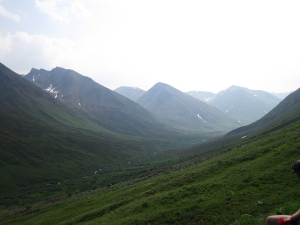Anywho our first pass was so tall that the North side we were crossing was still snow covered. Since the re-ration plane took our snow gear, our only option was to kick in steps up the steep slope, and hope an avalanche didn’t decide to take us all out. So up we went. The view was amazing, and on our way we ran into four caribou (a mom, two adults and a teeny baby) who were curious about us at first, and then ended up running off into the distance. I was amazed at how easily they moved over such slippery, steep, snow covered slopes, and after making several jokes about catching two each (one for riding and one for our packs), we moved on.