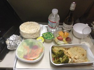 My gluten free dinner: rice cakes + butter, salad + gf dressing, fruit, chicken and roasted veggies, and a small bottle of complimentary white wine. Pretty decent for an in-flight meal! Filled me up, and I was ready to drift off to sleep.