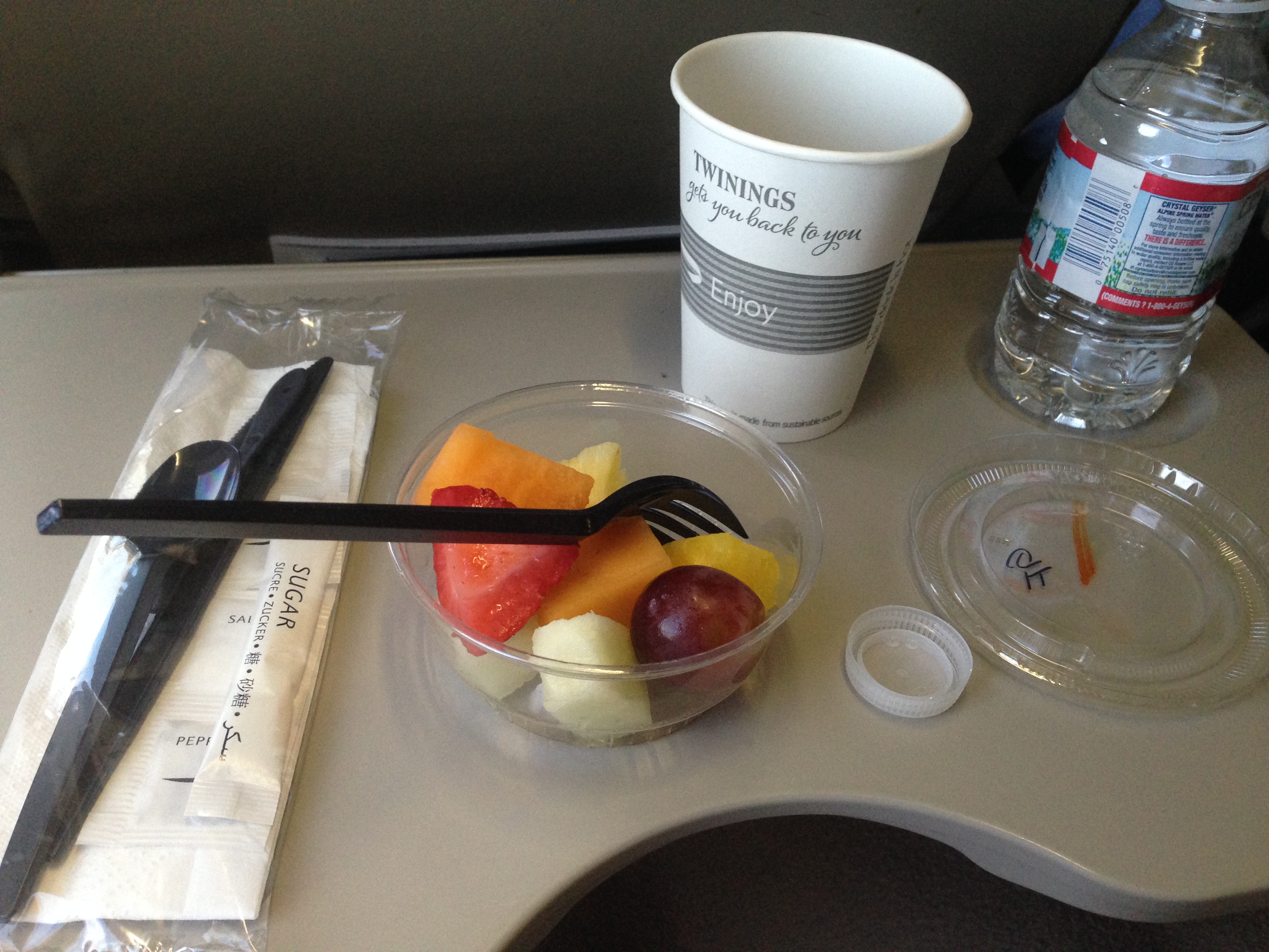 Several hours later, I woke up to the sun making its way over the Atlantic. I checked the iPad which said we were somewhere over the far northern Atlantic, about to fly over the British isles. I brushed my teeth, read, and was given tea and some fruit for breakfast. The gluten free option here wasn’t as extensive, but I don’t usually eat as much for breakfast, so I was still satisfied.
